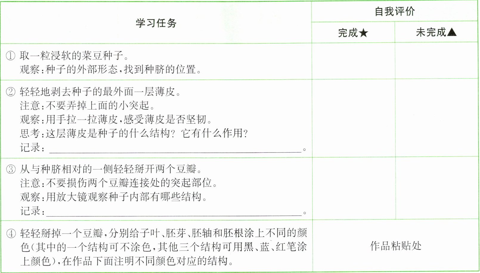 指导:由表及里,先观察外部形态,再观察内部结构。请同学们对照教科书上菜豆种子的结构示意图,完成下列学习任务和自我评价。