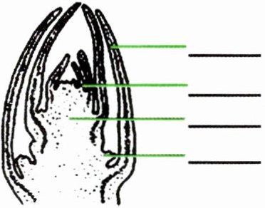 1. 枝芽。 2. 顶端分生组织、幼叶、芽轴、芽原基。