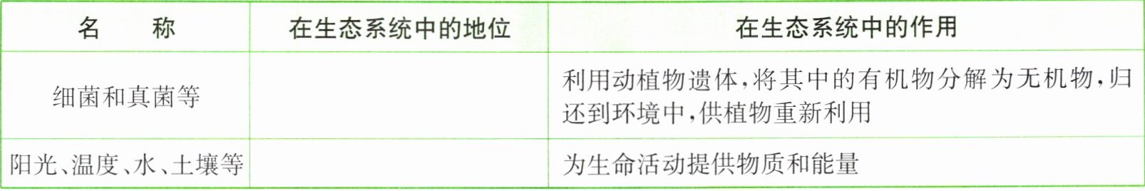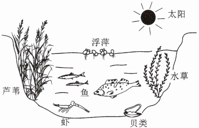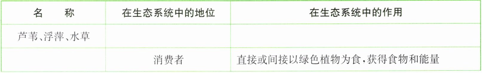 观察下面的池塘生态系统模式图,认识图中的各种生物,分析图中各种生物在生态系统中的地位和作用,将分析结果填入下表中。