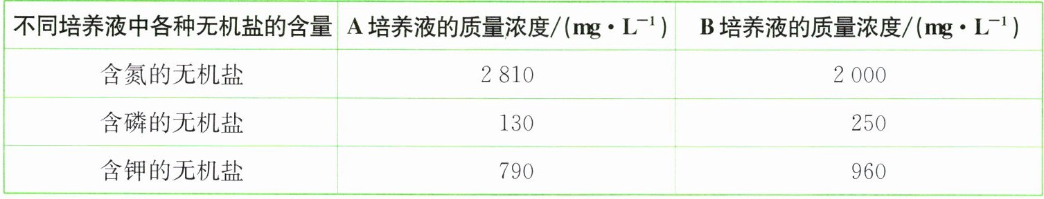 答案:1. 不同之处是A培养液和B培养液相比,含氮的无机盐占比较大,含磷和含钾的无机盐占比较小。因为分别适用于栽培叶用和茎用的蔬菜,不同的无机盐对植物的生长有不同的作用。