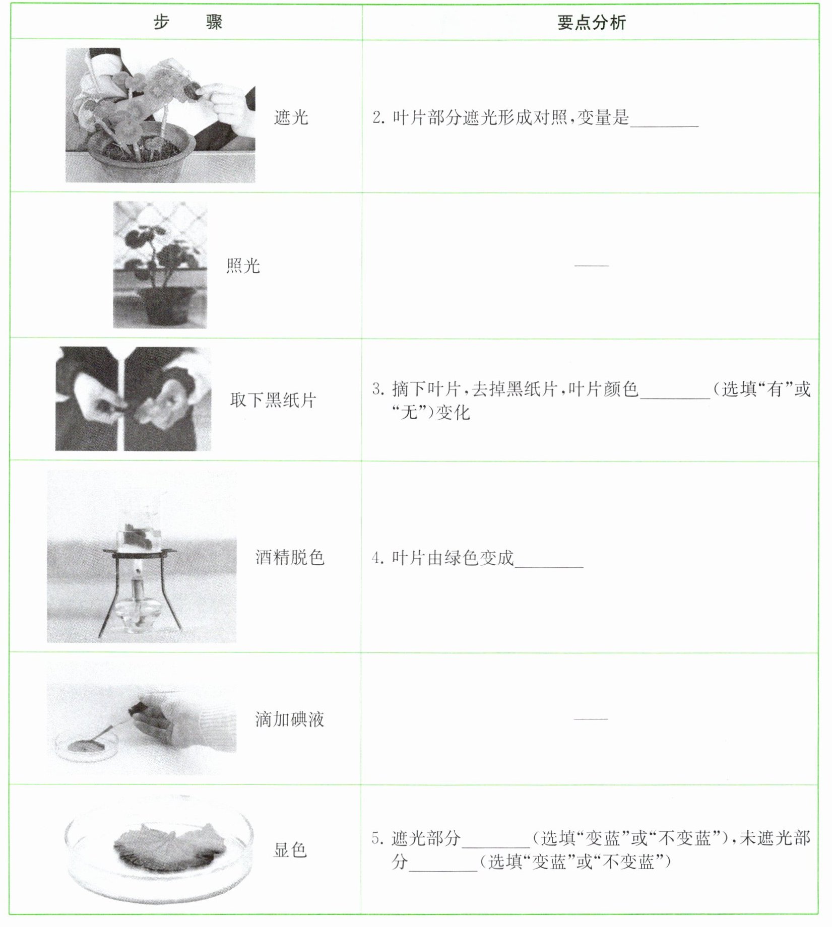1. 将叶片内原有的淀粉运走或耗尽 2. 光 3. 无 4. 黄白色 5. 不变蓝 变蓝 实验结论:淀粉