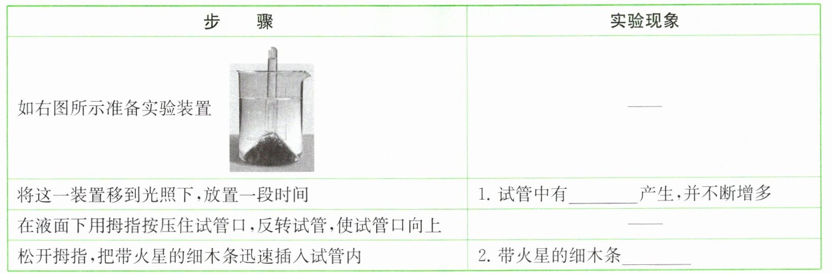 器材:漏斗,烧杯(直径比漏斗稍大),试管,细木条,火柴,金鱼藻,清水等。