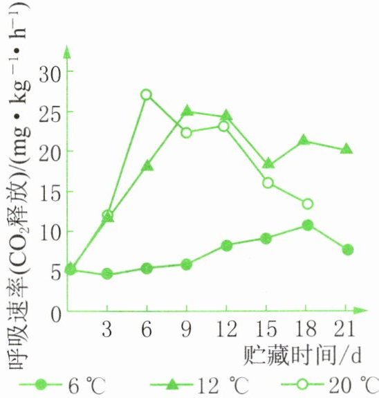 5. (双选) 果实采收后放置一段时间会出现呼吸高峰,这是果实成熟的标志。下图为不同温度条件下果实呼吸速率与贮藏时间的关系,下列相关叙述错误的是(