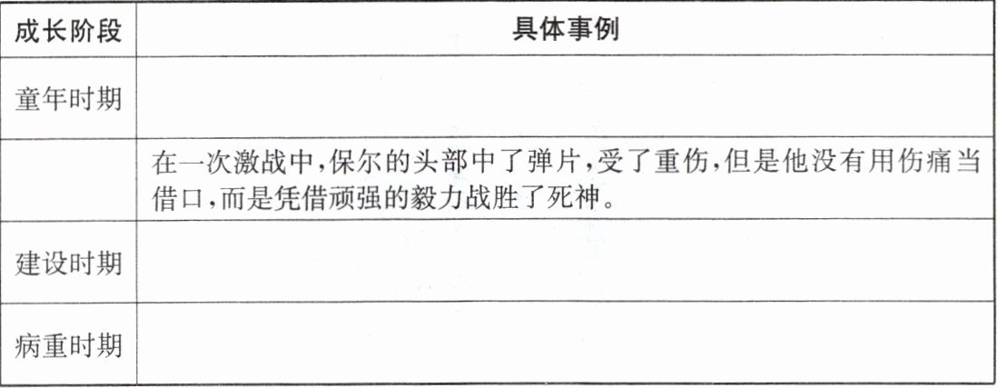 2. 主角在不同成长阶段经历锻造,最终铸就了钢铁般的意志。请根据小说内容填写下列表格。