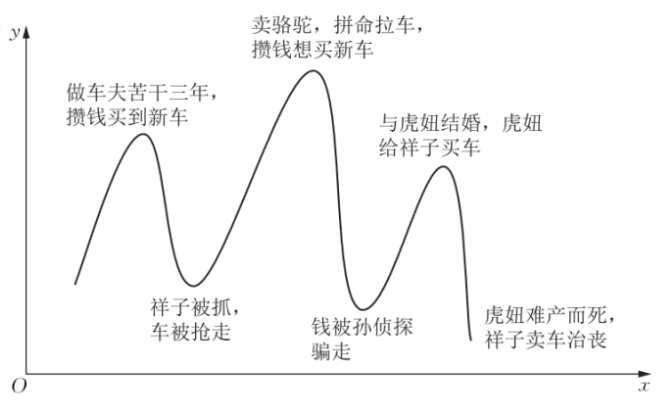 1. 任务一:祥子的一生可谓起起落落,请以坐标系的形式,呈现祥子一生命运的起伏变化。x 轴为造成祥子命运变化的事件,y 轴为祥子命运的起伏,并配合简短的文字进行说明。