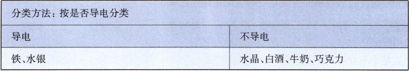 10. 有六种物质:铁、水银、水晶、白酒、牛奶、巧克力。请根据物质的物理属性将它们分成两类,并仿照示例填空。