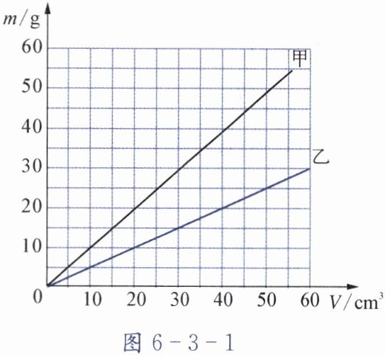 13. 图6 - 3 - 1所示是甲、乙两种物质的m - V图像,请根据图像判断甲、乙两种物质密度的大小关系,并说明理由。