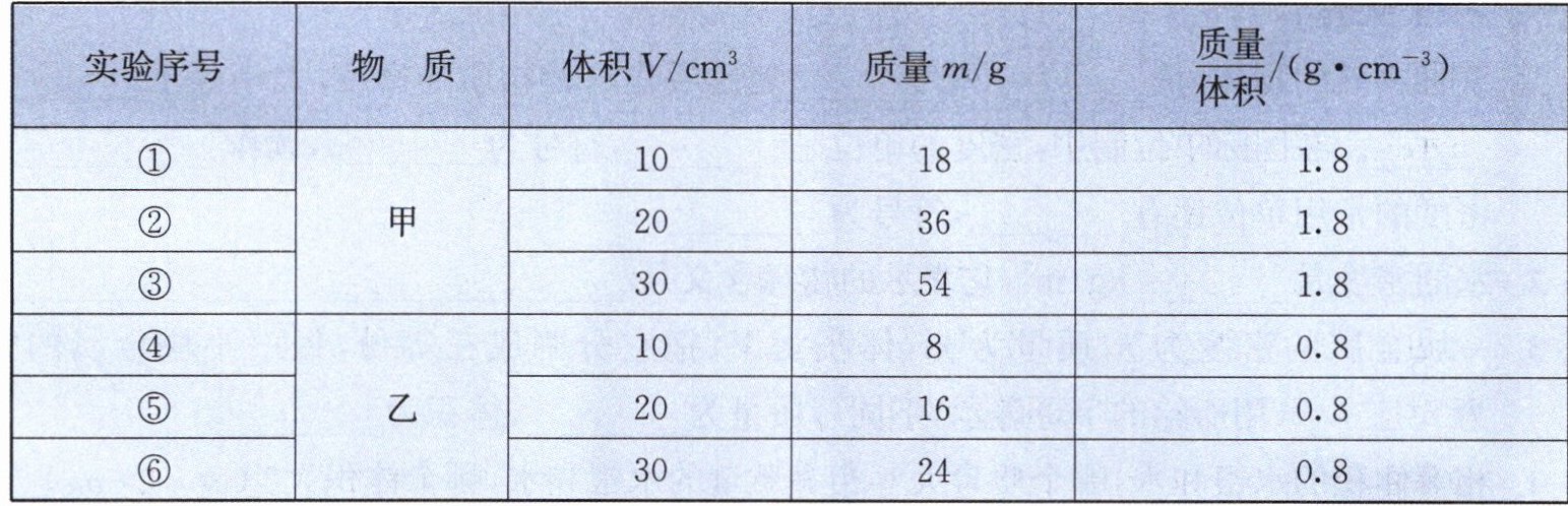 的两组数据,可得出结论:相等体积的甲、乙两种液体,它们的质量是不相等的。