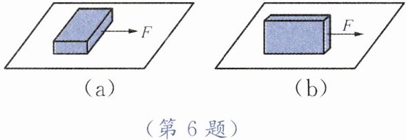 6. 如图所示,表面粗糙情况相同的长方体木块在水平力$F$作用下运动,水平面作用于木块的滑动摩擦力在图(a)、(b)两种情况中(