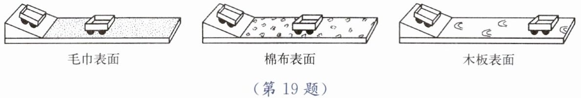 答案:19. (1) 让小车从斜面的同一高度释放 (2) 木板 毛巾 (3) 小车速度相等时,受到的摩擦力越小,运动的距离越远