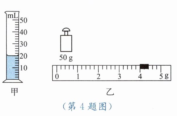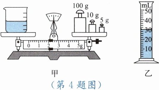 4. 在测量盐水密度的实验中,小明的实验方法和步骤完全正确。图甲是他将烧杯中的部分盐水倒入量筒后,天平重新平衡时的情景;图乙是量筒中液面的示数。