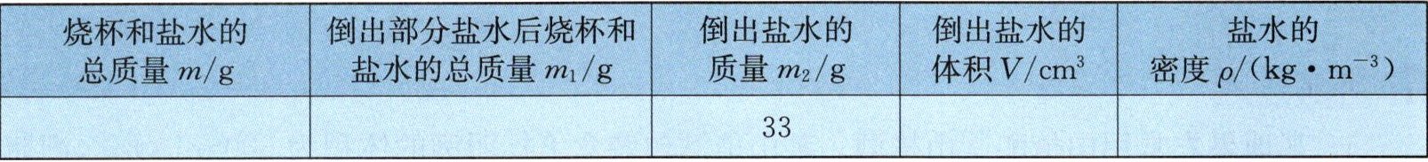 |烧杯和盐水的总质量 m/g|倒出部分盐水后烧杯和盐水的总质量 m₁/g|倒出盐水的质量 m₂/g|倒出盐水的体积 V/cm³|盐水的密度 ρ/(kg·m⁻³)|