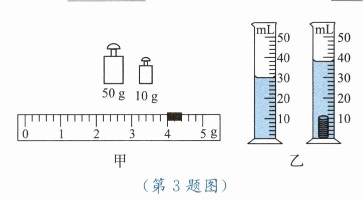3. 为了测量一元硬币的密度,小刚用天平测量 10 枚硬币的质量,天平平衡时右盘所加砝码及游码的位置如图甲所示,图乙是 10 枚硬币放入量筒前后的液面情况。由此可得,10 枚硬币的质量为