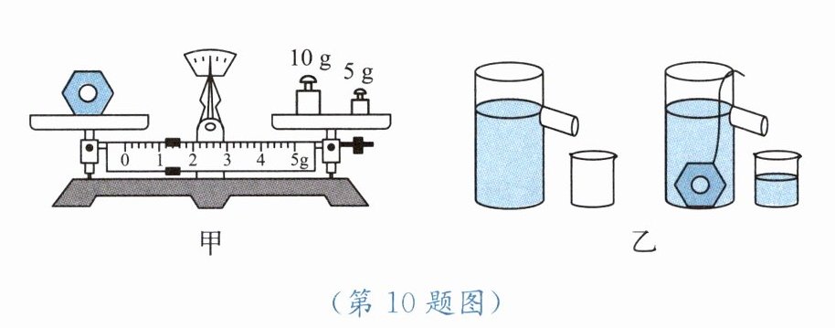 10. 小明设计了一个测量金属螺母密度的实验。实验器材有托盘天平(含砝码)、小烧杯、溢水杯、水和细线。主要实验步骤如下: