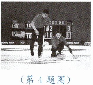 4. 如图所示,冰壶运动是冬奥会比赛项目之一。运动员穿的两只鞋的鞋底材质不同。蹬冰脚的鞋底为橡胶制成,在向后蹬地的过程中,脚受到的摩擦力方向