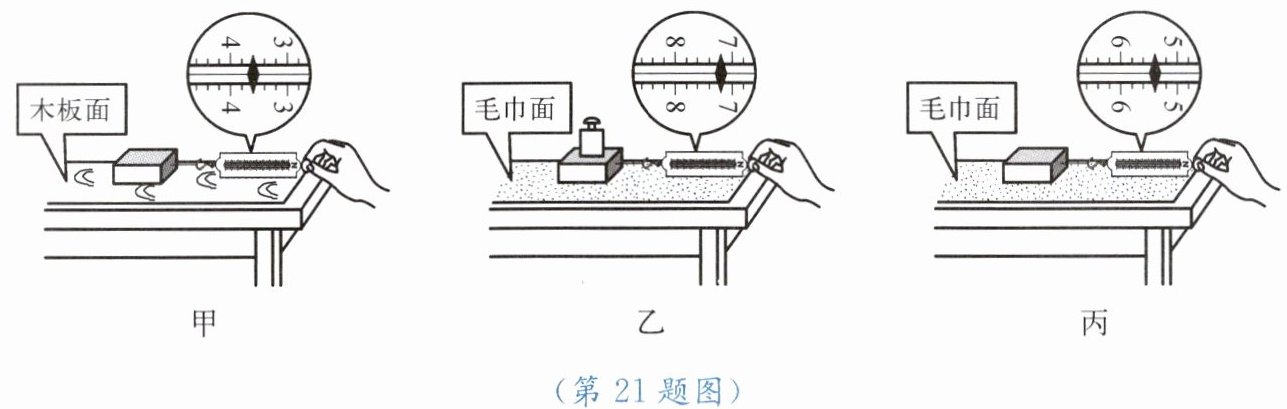 答案:21. (1)等于 (2)错误 没有控制接触面的粗糙程度相同 (3)压力一定时,接触面的粗糙程度越大,物体受到的滑动摩擦力就越大