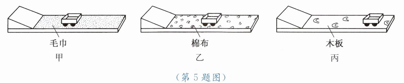 5. 小明利用如图所示的装置探究阻力对物体运动的影响。他先后在水平桌面上铺上毛巾、棉布、木板,三次分别将同一小车放在同一斜面上的同一高度,然后用不同的力推一下小车,使其沿斜面向下运动,观察小车移动的距离,从而得出阻力和运动的关系。