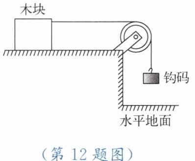 12. 如图所示,水平台面由同种材料制成,各处的粗糙程度相同,在它上面放着质量为 $ m_1 $ 的木块,将木块用轻绳跨过定滑轮与质量为 $ m_2 $ 的钩码相连。木块在平行于台面的轻绳的拉力作用下做匀速直线运动,运动一段时间,钩码触地后立即静止,木块继续滑动一段距离停在台面上。绳重、滑轮与绳间的摩擦均忽略不计。下列说法中正确的是(
