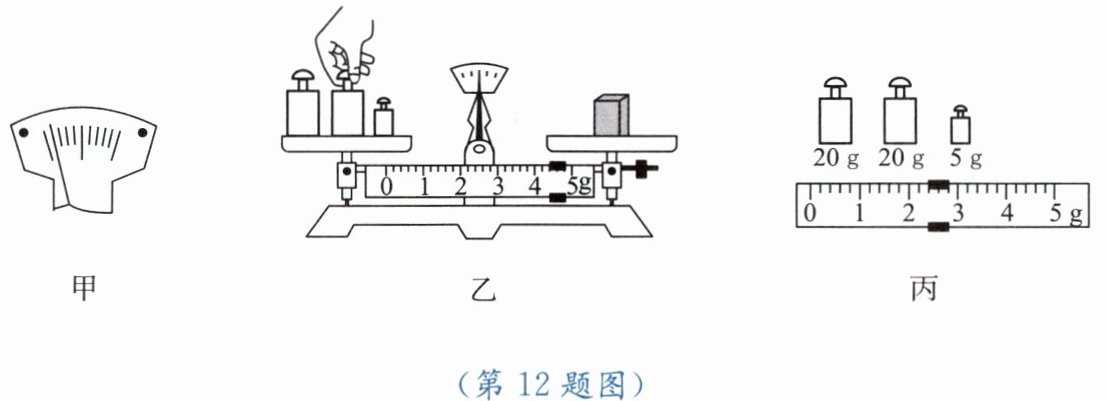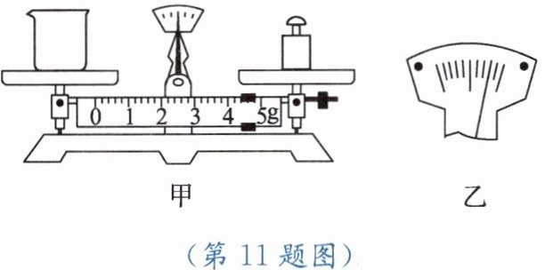 11. 小明想用托盘天平称出 20 g 的水。他先测出空烧杯的质量,如图甲所示。然后在右盘中增加 20 g 砝码,接着向烧杯中注入一定量的水,指针位置如图乙所示。接下来的操作应该是(