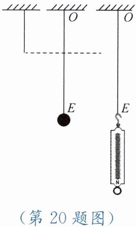 20. 如图所示,在竖直木板上固定一根橡皮筋,当在橡皮筋下端挂一个质量为 250g 的小球时,橡皮筋伸长到 $ E $。现用一个弹簧测力计向下拉橡皮筋,使橡皮筋一端再次伸长到 $ E $,该弹簧测力计的示数约为