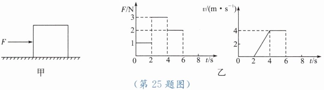25. 如图甲所示,放在水平地面上的物体,受到方向不变的水平推力 $ F $ 的作用, $ F $ 的大小与时间 $ t $ 的关系和物体运动速度 $ v $ 与时间 $ t $ 的关系如图乙所示。请回答下面的问题。