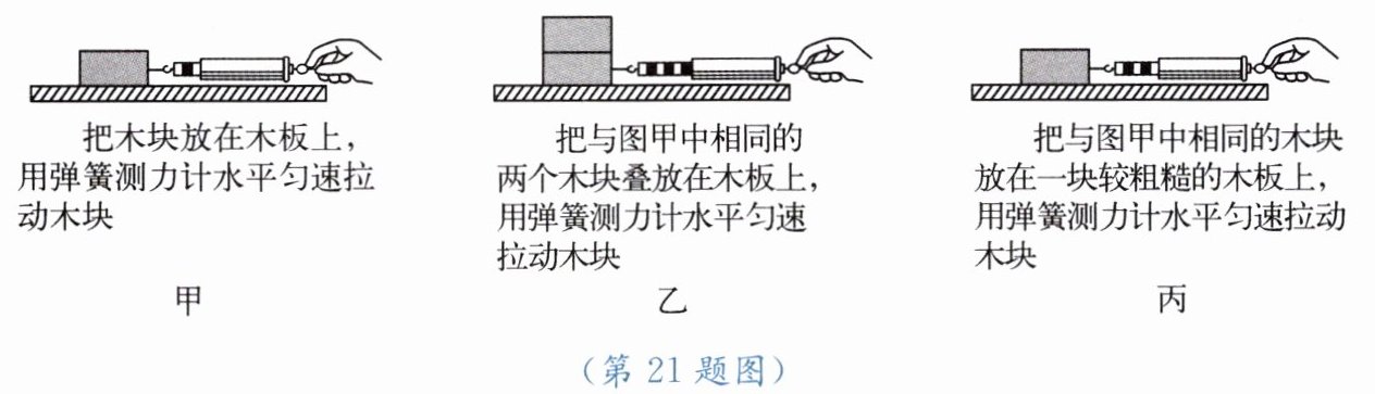 21. 如图所示,小华在探究滑动摩擦力的大小与哪些因素有关。