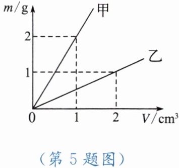 解:由图像可知,当$V_{甲}=1\ \mathrm{cm}^3$时,$m_{甲}=2\ \mathrm{g}$;当$V_{乙}=2\ \mathrm{cm}^3$时,$m_{乙}=1\ \mathrm{g}$。