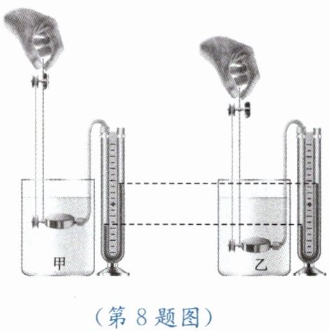 8. 将同一液体压强计的橡皮膜盒先后放入甲、乙两种液体中,现象如图所示。关于这两种液体的密度大小关系,下列说法中正确的是(