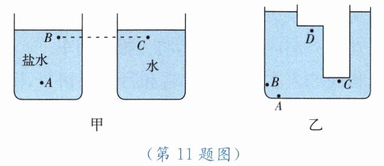 11. 如图所示,比较图中各点压强的大小:(1) 在图甲中,$B$点和$C$点深度相同,而$A$点比$B$点深,各点的压强$p_{A}\_\_\_\_\_\_p_{B}\_\_\_\_\_\_p_{C}$。(2) 在图乙中,$A$、$B$、$C$、$D$各点在液体中的深度如图所示,各点的压强$p_{A}\_\_\_\_\_\_p_{B}\_\_\_\_\_\_p_{C}\_\_\_\_\_\_p_{D}$。(选填“$>$”“$<$”或“$=$”)
