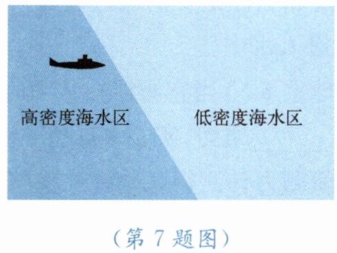 7. 如图所示,海面下的潜艇从高密度海水区驶入低密度海水区时,如果不采取措施就会急剧下沉导致灾难性后果,称为“掉深”。造成潜艇“掉深”的原因是(