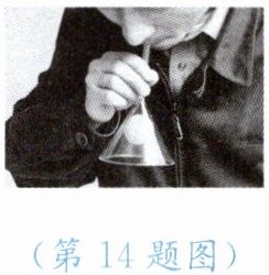 14. 在倒置的透明漏斗里放置一个乒乓球,用手指托住乒乓球,松手后乒乓球受重力作用将下落。如图所示,若向倒置的漏斗中吹气,松手后,乒乓球不但不会被吹下去,反而被“吸”住了。这是因为乒乓球上方空气的流速