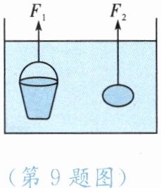 9. 将质量相等的铁桶和实心铁球用绳子系好后同时浸没在水中,静止在如图所示的位置,绳子对它们的拉力 $F_{1}$ 和 $F_{2}$ 的大小关系是(