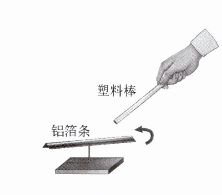 3. 小明利用所学知识制作了一个简单的验电器。他将一根针插在绝缘底座上,把折成“V”形的铝箔条水平架在针的顶端。当带电的塑料棒靠近铝箔条的一端时,铝箔条会发生偏转,如图所示。小明制作该验电器所利用的知识是