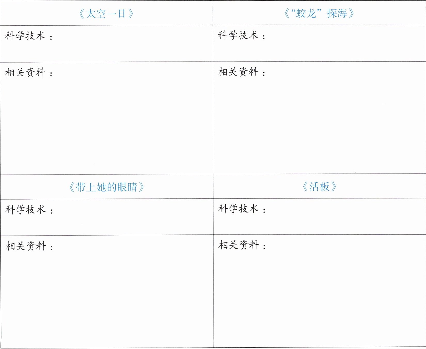 本单元课文中所写的“神舟”飞天、“蛟龙”探海、活字印刷术等都是中国科技事业的重要成就,“眼睛”科技、地心探索等也在现实科技中有所体现。借助书籍、网络等资料完成任务单,更加全面地了解课文所写的事件。