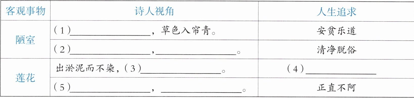 答案:2. (1)苔痕上阶绿 (2)无丝竹之乱耳 无案牍之劳形 (3)濯清涟而不妖 (4)洁身自好 (5)中通外直 不蔓不枝