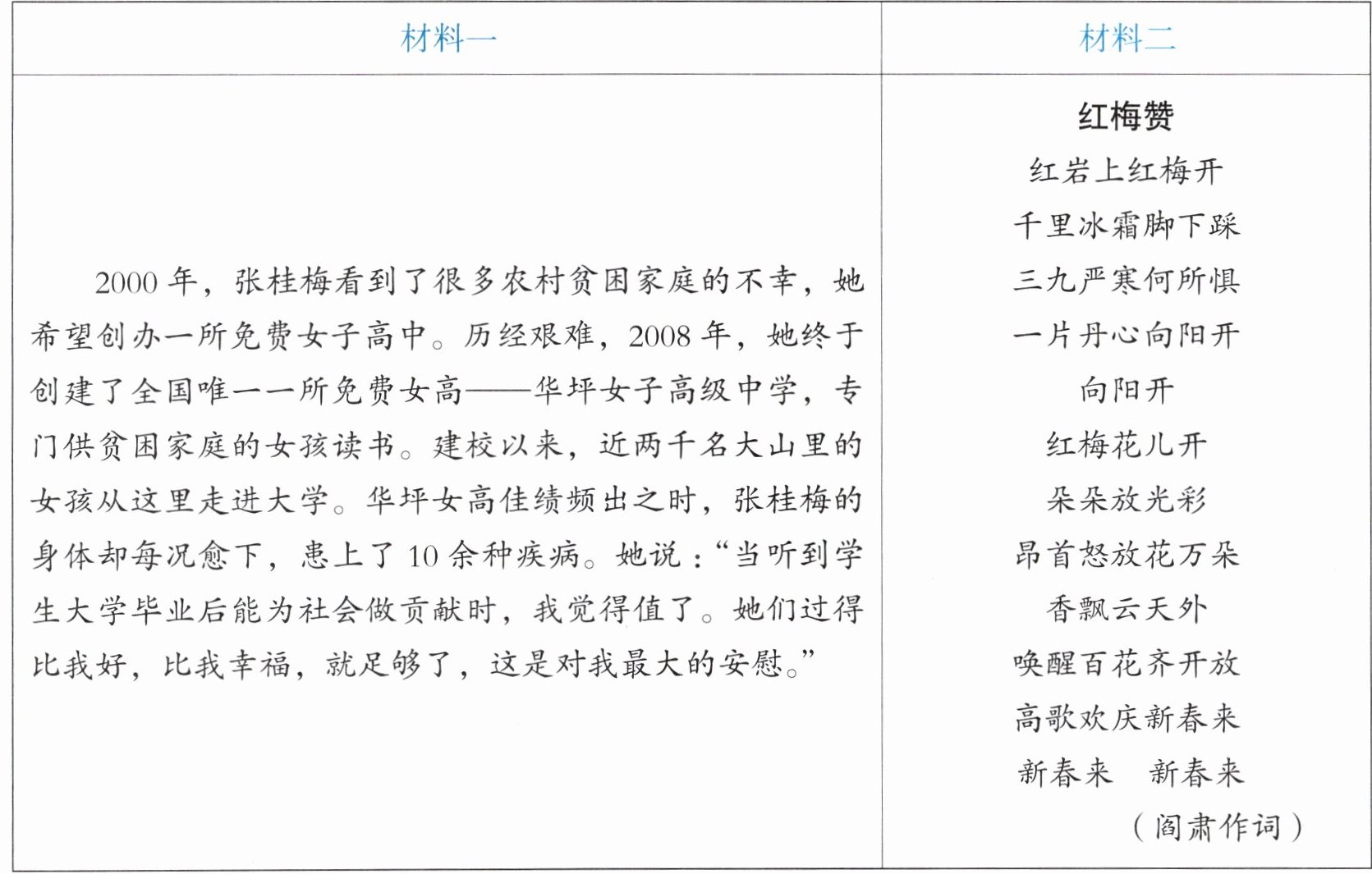 8. 第⑦段中,学生回忆离校时对着朝夕相伴了三年的教学楼唱《红梅赞》的情形感人至深。请结合文中相关内容和下面两则材料,简要分析学生离别时唱《红梅赞》有哪些深意。