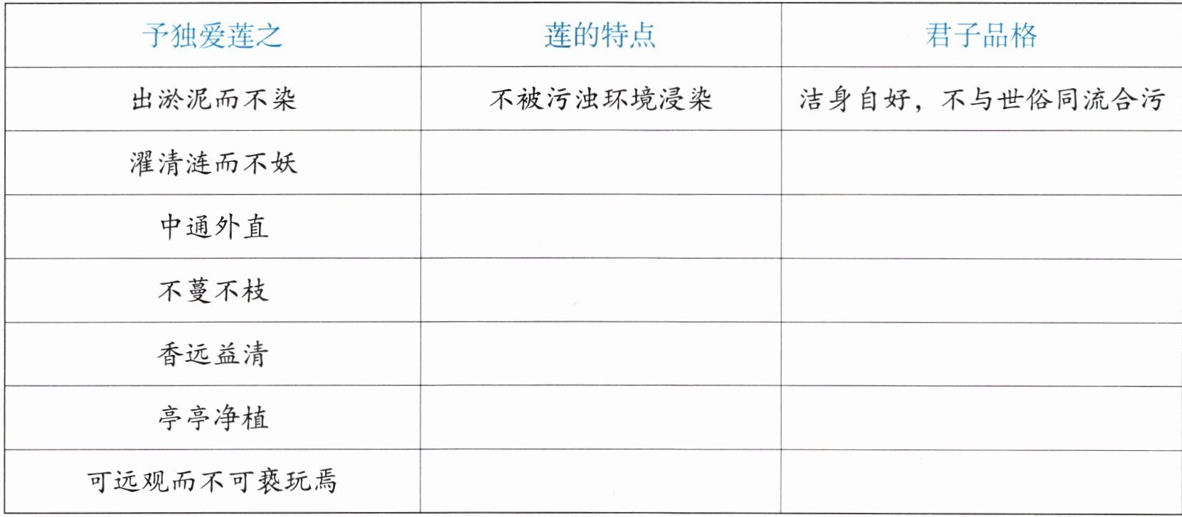 阅读《爱莲说》中关于“莲”的整体形象的句子,根据提示,完成下面表格。