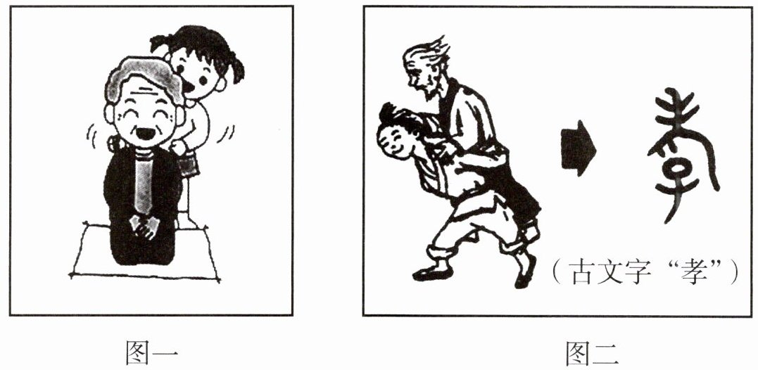 [示例 2] 推荐图二。图二为一个年轻人背着老人,正是“孝”字的变形,生动形象,更能让我们理解“孝”字的内涵。
