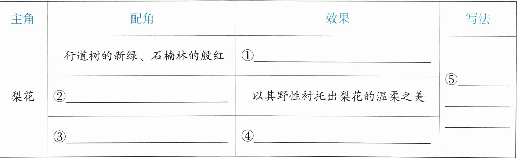 7. 作者说“梨花当然是岭上的主角”,那哪些是作者发现的配角呢?根据文章内容,完成表格。