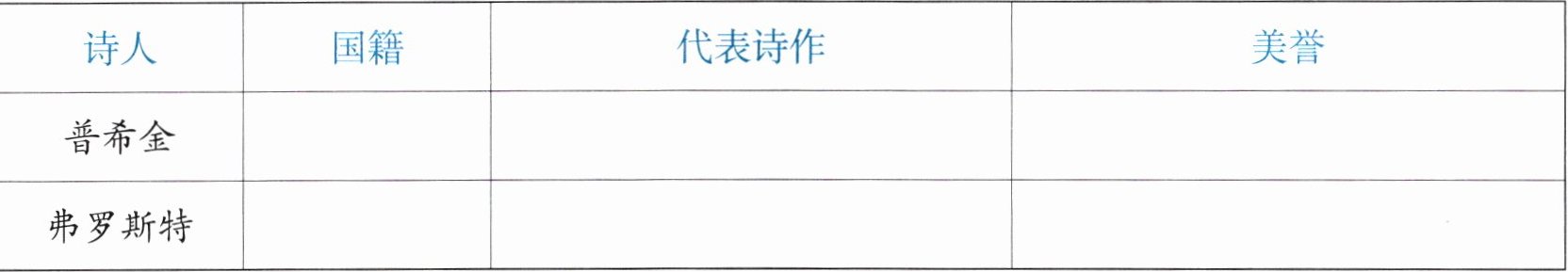 1. 查阅资料,搜集普希金和弗罗斯特两位诗人的信息,填写下表。