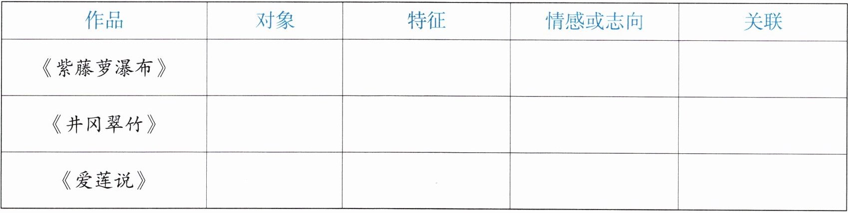 《井冈翠竹》:对象井冈山上的翠竹,特征生机无限、坚贞不屈,情感或志向赞美井冈山人民、中国人民的革命气节和革命精神,关联井冈翠竹的用途与革命事业息息相关