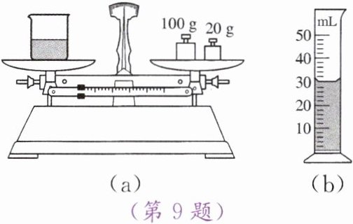 9. 小明为测量食用油的密度,设计了下面的实验数据记录表格,表格中已经记录了烧杯和食用油最初的总质量。他将烧杯中一部分食用油倒入量筒后,烧杯和剩余食用油的总质量如图(a)所示。从烧杯中倒入量筒内的食用油的体积如图(b)所示。