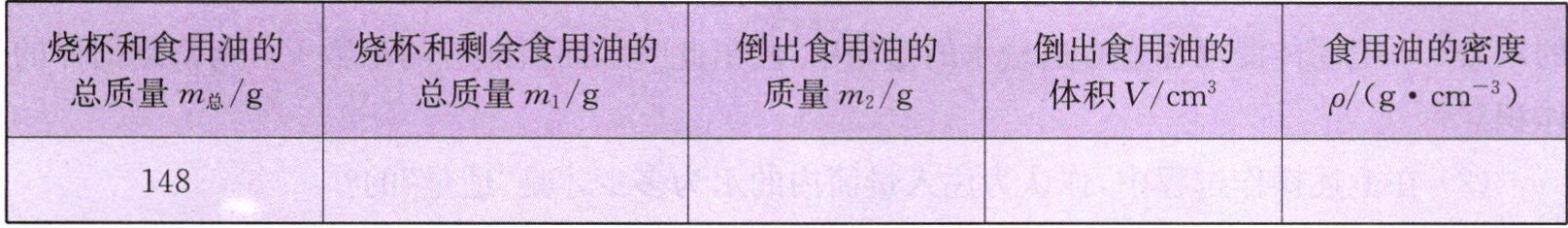 | 烧杯和食用油的总质量$m_{总}/g$ | 烧杯和剩余食用油的总质量$m_{1}/g$ | 倒出食用油的质量$m_{2}/g$ | 倒出食用油的体积$V/cm^{3}$ | 食用油的密度$\rho/(g· cm^{-3})$ |