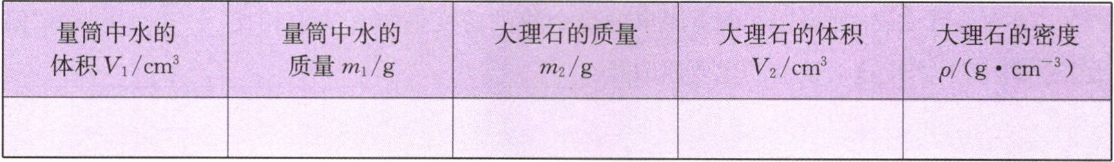 |量筒中水的体积$V_{1}/cm^{3}$|量筒中水的质量$m_{1}/g$|大理石的质量$m_{2}/g$|大理石的体积$V_{2}/cm^{3}$|大理石的密度$\rho/(g· cm^{-3})$|