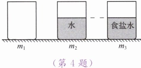 4. 小华想测量食盐水的密度,能找到的器材有:两个相同的透明杯子、清水(ρ水=1 g/cm³)、食盐水、记号笔和托盘天平。因为没有量筒,无法直接测量液体体积,小华想到借助V食盐水=V水的方法,如图所示,她用天平测得m₁=52.0 g、m₂=132.0 g、m₃=141.6 g,利用这三个数据完成了食盐水密度的测量。