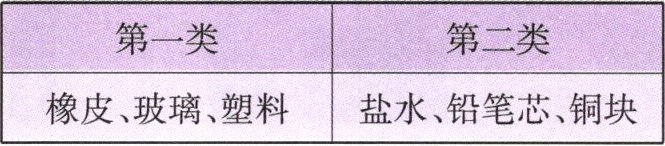 3. 现有橡皮、玻璃、铜块、盐水、塑料、铅笔芯六种物质,小明将它们分成两类,如右表所示。小明将这些物质分类的依据是(