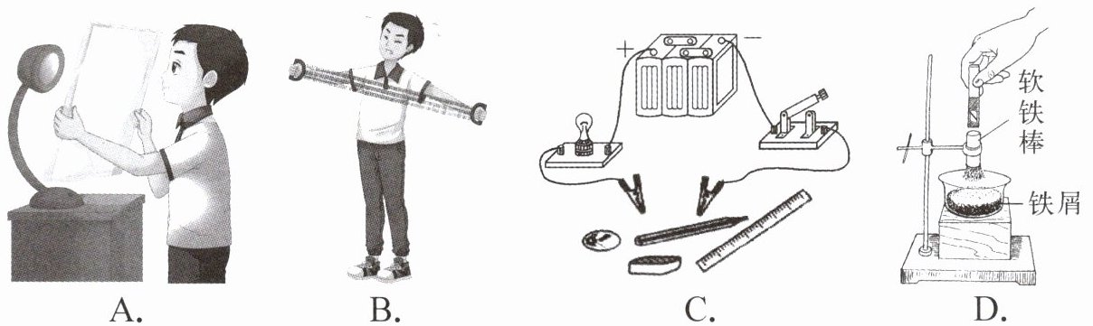 A图是探究平面镜成像特点,B图是探究力的作用效果,C图是探究电路是否通路,D图中软铁棒能吸引铁屑,说明其具有磁性。