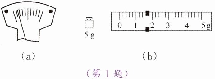 指针偏向分度盘左侧,应向右调节游码。右盘砝码5g,游码对应1.6g,总质量5g+1.6g=6.6g。1枚大头针质量6.6g÷80=0.0825g=82.5mg。