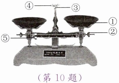 10. 如图所示为托盘天平的结构示意图,请在下面的横线上填写与图注序号对应的名称。