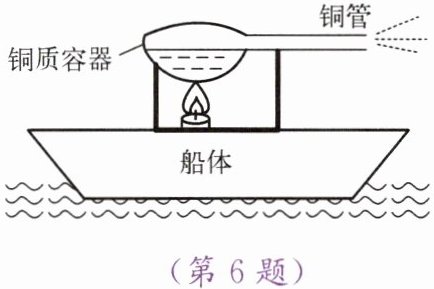 6. 如图所示是小明制作的简易蒸汽船模型。将盛有一定量水的铜质容器安装在船体上,用蜡烛对铜质容器底部进行加热,一段时间后铜管会向右喷出蒸汽,蒸汽船模型就会向左行驶。